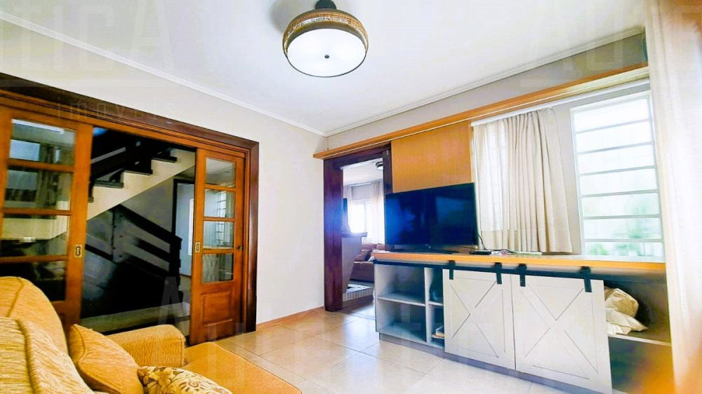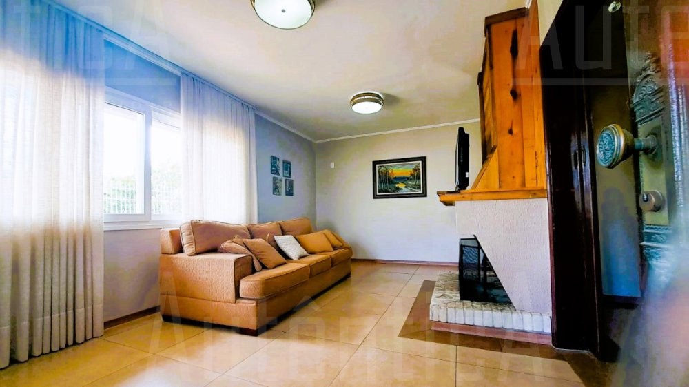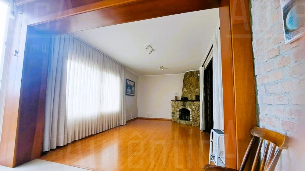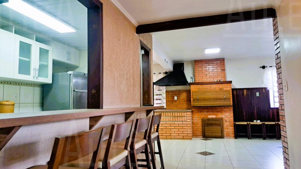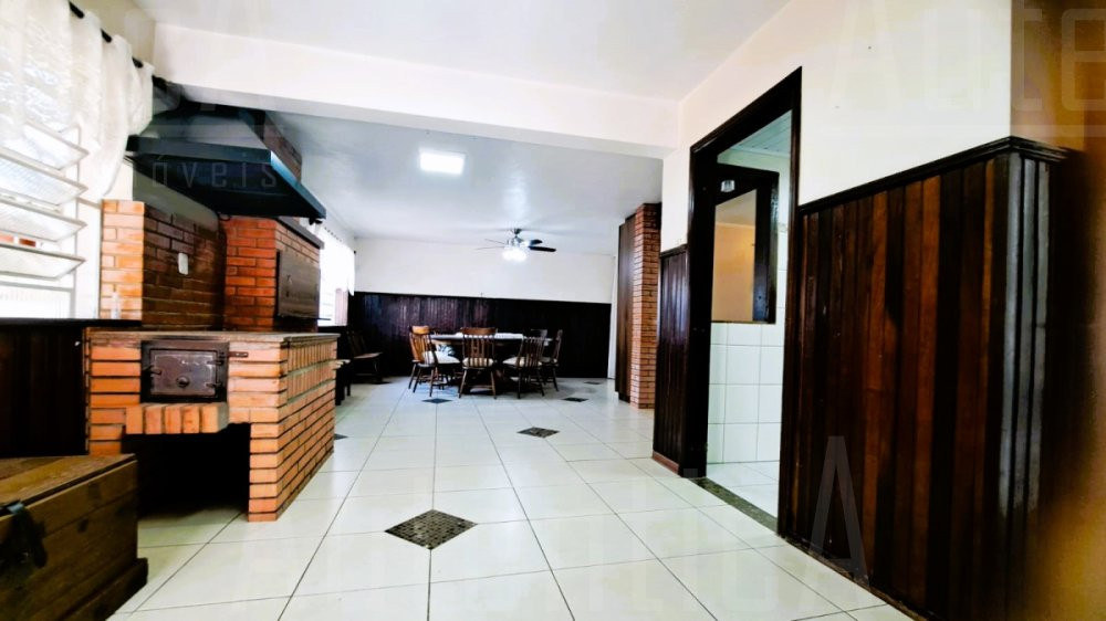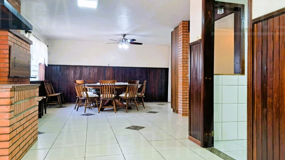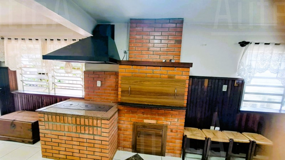 Primeiro pavimento: Sala principal com lareira, sala de TV, sala home office, cozinha, área de serviço, banheiro social, sala depósito, amplo salão de festas mobiliado, com cozinha, churrasqueira e fogão a lenha, área de garagem e estacionamento para 03 carros.