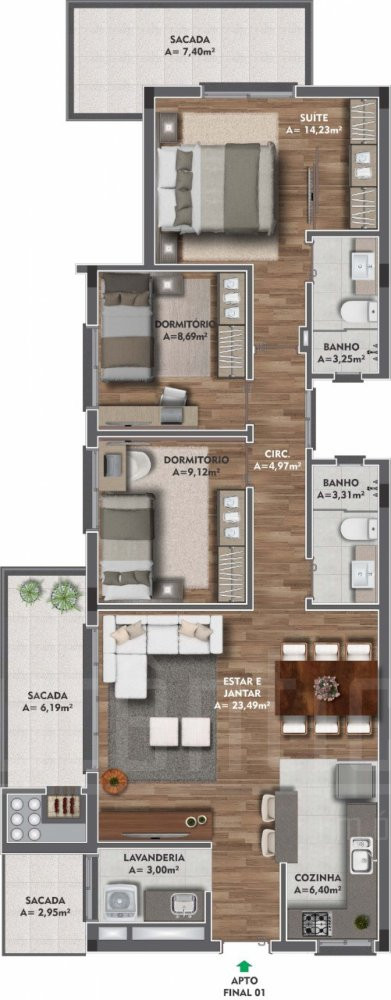Lindo apartamento semimobiliado com 03 dormitórios sendo 01 suite com sacada, sala de estar e jantar conjugadas com uma linda e ampla sacada com churrasqueira, 02 vagas de garagem, área de serviço individual com sacada, espera para água quente, split, gás central, porcelanato, laminado, gesso, posição solar sul/oeste.