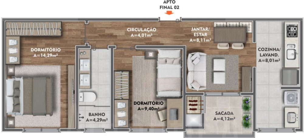 Os apartamentos possuem frente norte, 2 dormitórios, salas em conceito aberto com sacada e churrasqueira, cozinha e área de serviço integradas, 1 banheiro, 1 vaga de garagem, aberturas em alumínio com persianas em pvc, piso laminado nas salas e dormitórios e porcelanato na cozinha, banheiros e sacada, espera para gás e split.